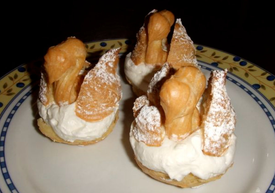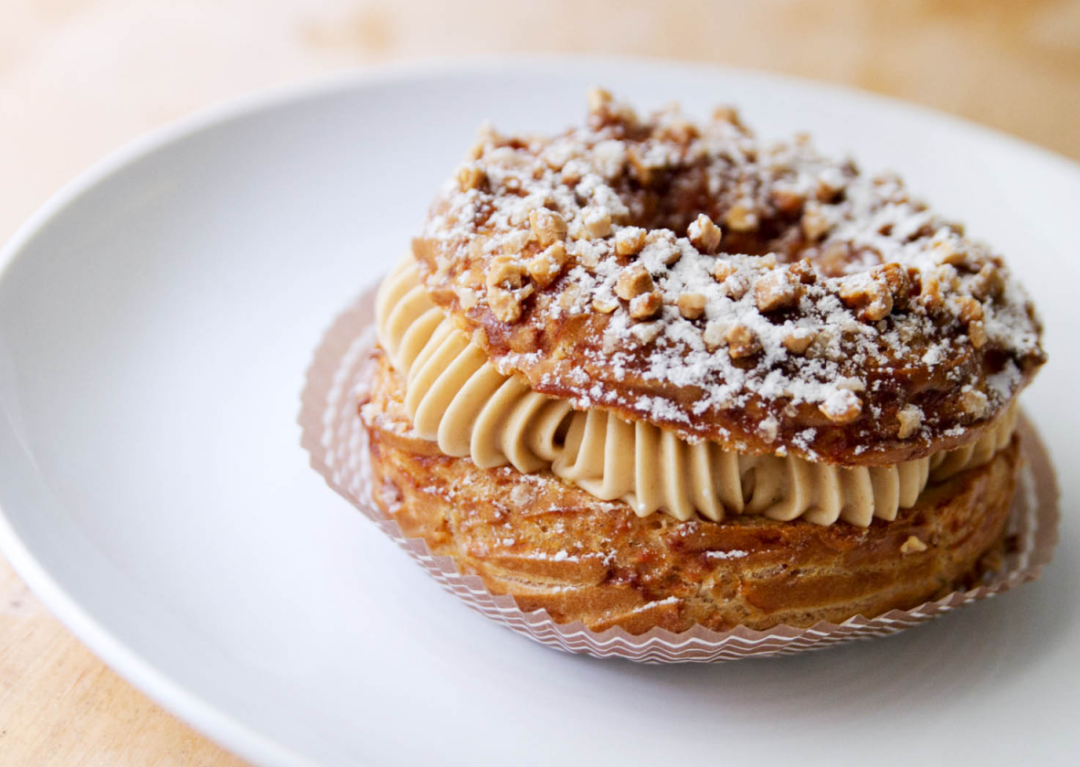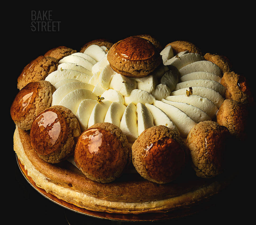 这款泡芙是以巴黎的圣奥诺雷大街命名,因为它最早诞生在这条街上的糕点店 La Maison Chiboust。1847年,为了纪念传奇法国糕点师 Saint Honoré,这家店推出了这款有着精致浪漫造型的泡芙。以千层酥皮打底,几粒圆形小泡芙用焦糖固定,中间用裱花袋挤一圈奶油作为装饰,是泡芙和蛋糕的完美结合。