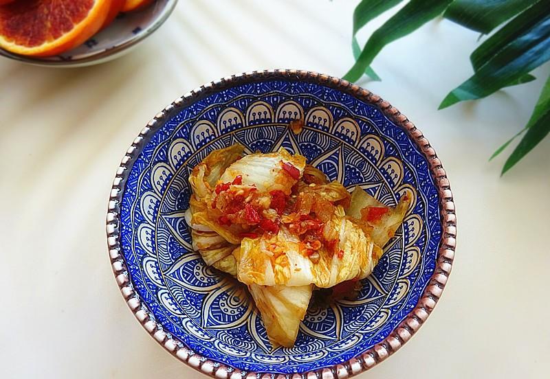 我自己腌制的辣白菜。现在外卖的很多,总觉得还是自己做的健康卫生。做法很简单:把大白菜分成四瓣或6瓣,撒上盐,腌渍一夜后用水冲洗,大略攥干;大蒜,生姜,梨,洋葱用搅拌机打碎,辣椒粉用开水烫一下搅拌,放入大蒜、生姜和洋葱末,拌匀后抹在每一片白菜叶之间,腌渍一天就可以吃了。