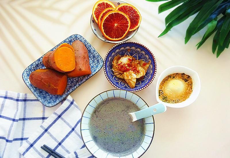 没开炉灶,用小家电一键完成,中间有空挡时间去做别的事,半小时所有的一切就都做好了,很合自己的胃口。今天没有做主食,用红薯当作主食了,蒸了一个酱油蛋,打了黑豆米糊,搭配小菜和水果。