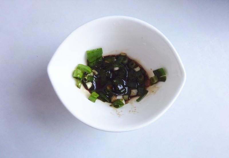 首先小碗内放入切碎的葱花,半汤勺酱油和一点香油搅拌匀。