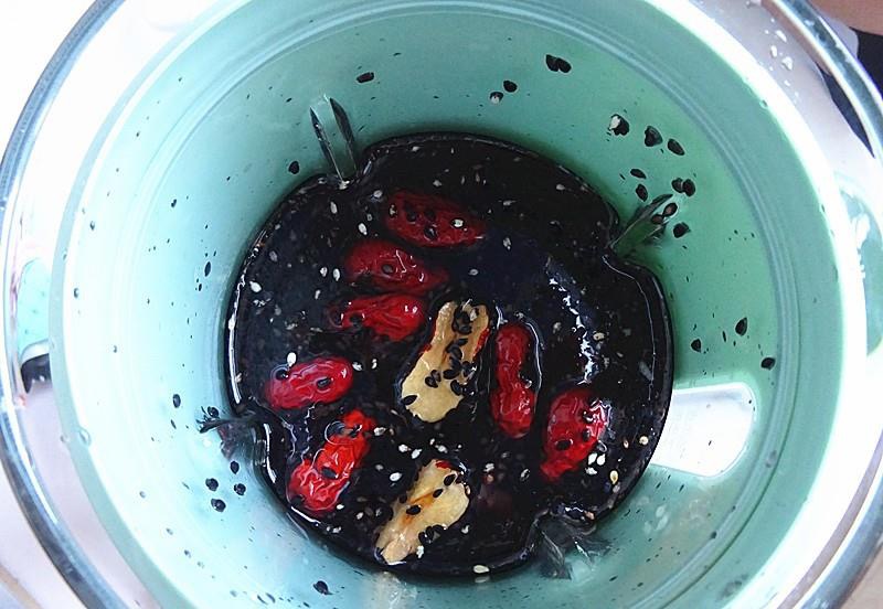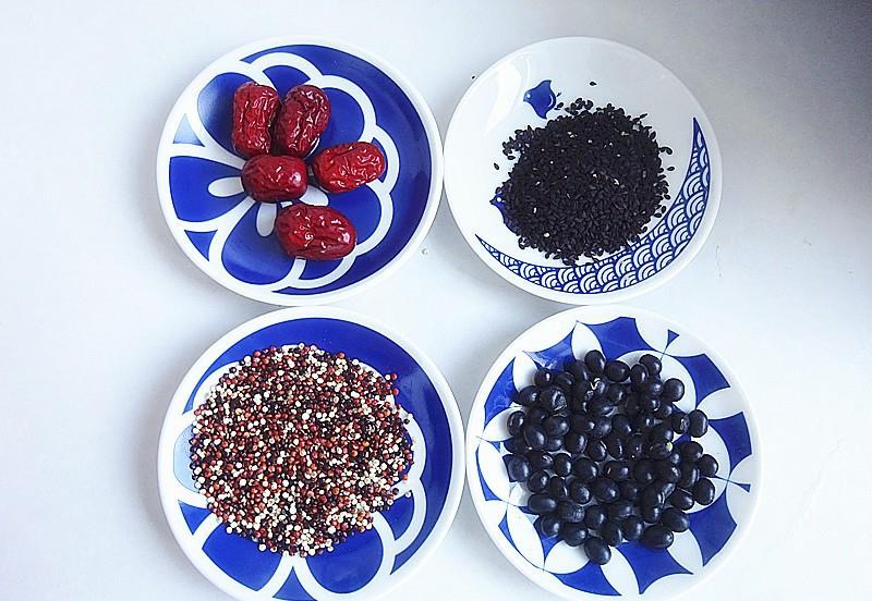 把三色藜麦和黑芝麻用漏勺洗干净,红枣剪下枣肉、枣核扔掉,黑豆洗干净,一切放入机器就可以了,20分钟后米糊自然打好。