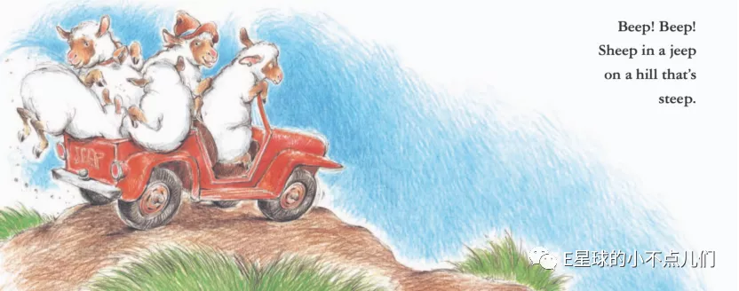 随着课程的推进,孩子可以独立阅读的绘本也会越来越多,比如学到”ee”这个元音组合的时候,老师精选了Sheep in a Jeep这本绘本。绘本的第一页就涉及到了beep,sheep,jeep,steep四个带有“ee”元音组合的单词,帮助孩子培养阅读能力的同时,锻炼自拼技巧。
