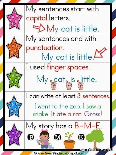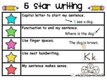 比如,首字母要大写,每个句子都要有标点符号,单词之间要有“手指距离”,书写要工整,写出来的内容别人能够看懂,故事要有开头、发展、结尾……