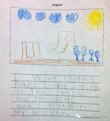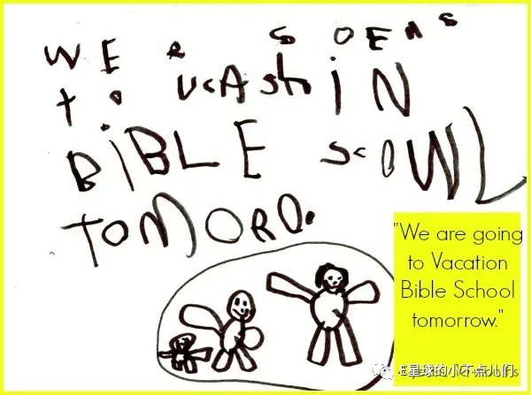这是最有意思的一个阶段:虽然孩子写下的单词往往并不正确,但是家长和老师可以“翻译”出孩子写的内容。